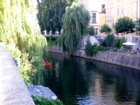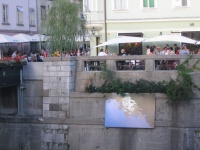 Looking south-ish across the river at Zlata Rubica restaurant (top of the line for Slovenes.) To left is Cobbler Bridge.