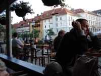 View to the Castle from our street, near our apartment. More importantly, to the left is where we had our first Slovenian dinner and beer! Square is near the end of this street.