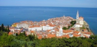 Piran (PEE-RAN). About 90-110 miles W-SW from Ljubljana on autobahn/freeway. Looking west across Adriatic toward Italy.